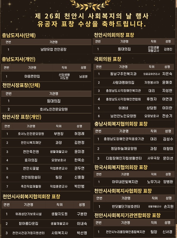 제 26회 천안시사회복지의 날 행사 유공자 표창수상 페이지 정보 작성자작성자 : 천사협 조회조회수 : 1,287회 작성일작성일 : 25-09-23 13:14 본문 수상을 축하 드립니다! 목록 이전글2025년 법인 정기 이사회의(2차) 개최 25.03.11 다음글「제26회 천안시사회복지의 날 행사」사회복지 유공자 추천 협조 요청 25.07.28